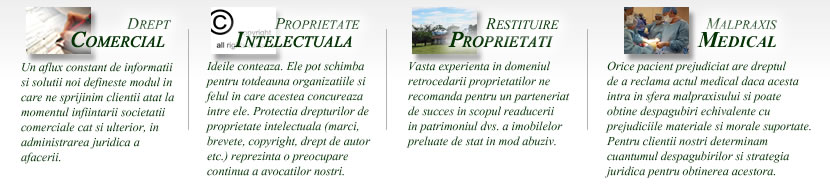 Experienta dobandita in numeroasele litigii in materie comerciala, cunoasterea in detaliu a dreptului muncii si a dreptului administrativ sunt intregite, in prezent, prin abordarea unor noi domenii de expertiza, care ne recomanda ca fiind un Cabinet de avocatura cu o arie de activitate complexa, adaptat cerintelor oricarui tip de companie.